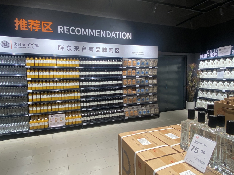 特色专区的自有品牌则分为胖东来自有品牌专区和永辉优选专区。前者上架DL精酿啤酒、DL洗衣凝珠、DL花生油等口碑单品,后者则带来橙汁、菜籽油、洁面巾等商品。针对胖东来自有品牌商品,门店也做了限购措施,例如饮料每种单品限购1种,酒品限购10件等,确保有序经营。