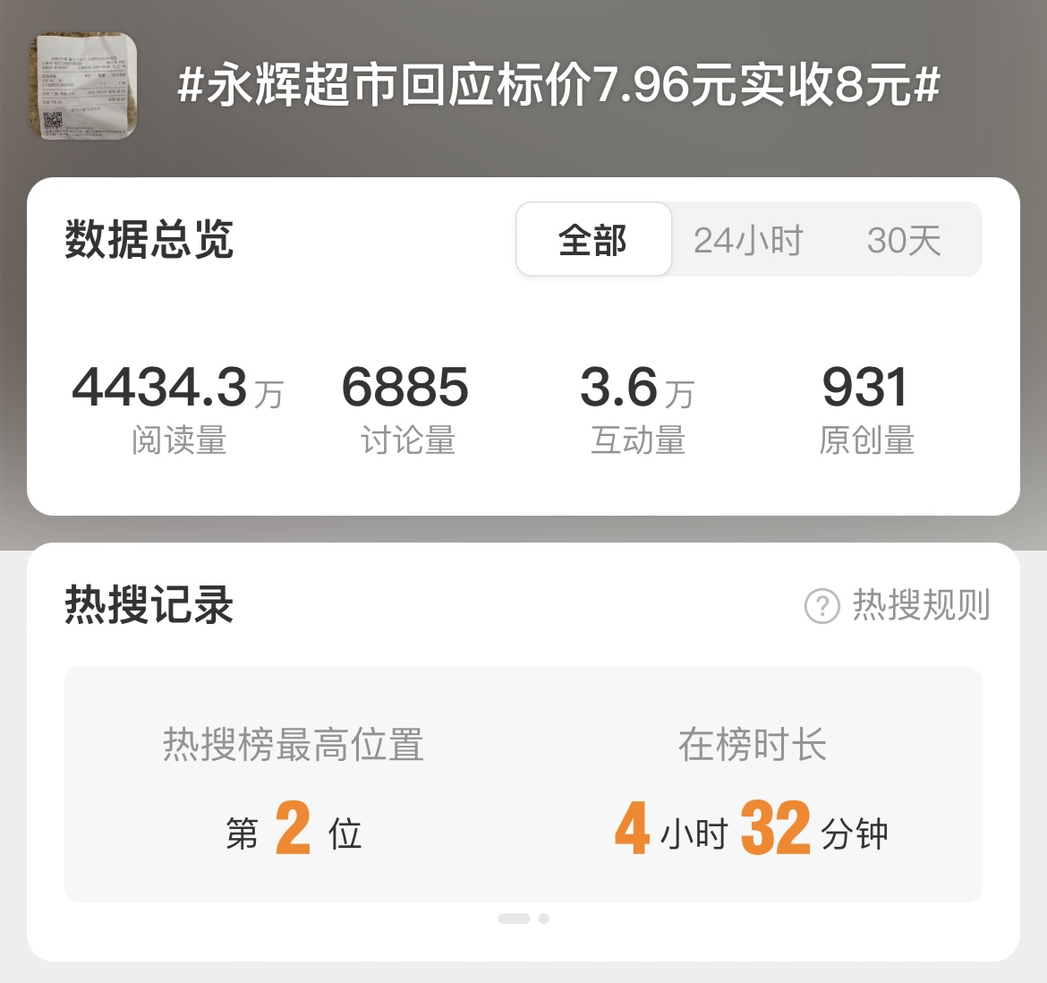 此前,据鲁网报道,4月20日,消费者刘先生在重庆永辉超市金源时代店购买标价为7.96元的淡虾米(二级),支付100元现金后收到找零92元。按照实际金额计算,刘先生应支付7.96元,但超市采用“分位四舍五入”规则,实际收取8元。“分位钱再少也是消费者权益,超市既未提前告知,也未在标价签上注明‘四舍五入’。”刘先生表示。