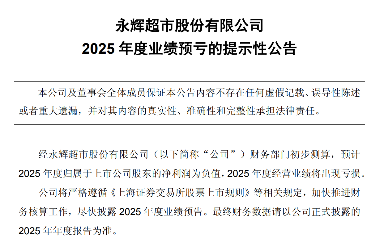1月12日晚间,永辉超市股份有限公司(以下简称“永辉超市”)发布公告称,经财务部门初步测算,预计2025年度归属于上市公司股东的净利润为负值,2025年度经营业绩将出现亏损。