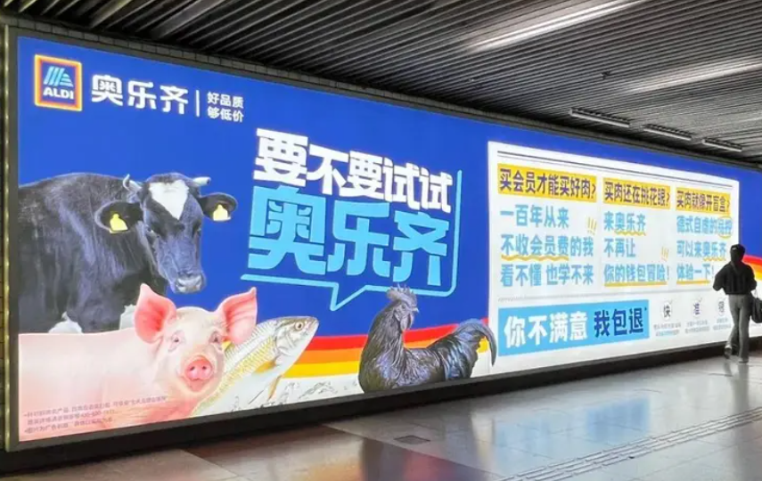 奥乐齐的广告直白又犀利,大字标注“幸好!奥乐齐超市小包装,买多买少都便宜”,小字则暗讽“夸张!隔壁家的瑞士卷没吃完就过期了”;另一则广告则突出“奥乐齐超市:小份更新鲜,不花会员费也便宜”,小字补充“传下去:逛超市不必买门票”,句句直指山姆的“大包装”和“会员费”两大特点,精准狙击山姆的经营短板。这种“影射式”广告并非首次出现,2024年5月,奥乐齐在上海地铁投放的广告,就已采用类似思路,通过对比凸显自身优势,暗戳戳内涵山姆。