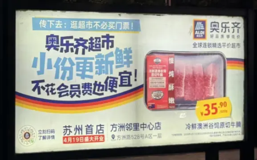 如果说盒马、家乐福的方式是直接喊话、公开控诉,那么德国零售品牌奥乐齐则选择了一种更具营销色彩的方式——以开业广告为载体,暗戳戳影射山姆,借助山姆的市场热度,快速打响自身品牌知名度。2025年4月,奥乐齐官宣走出上海,在无锡、苏州开设江苏首店,距离开业仅剩8天时,奥乐齐在苏州山姆会员店的停车场门口投放了“踢馆式”广告,直指山姆的经营痛点,引发行业关注和网友热议。