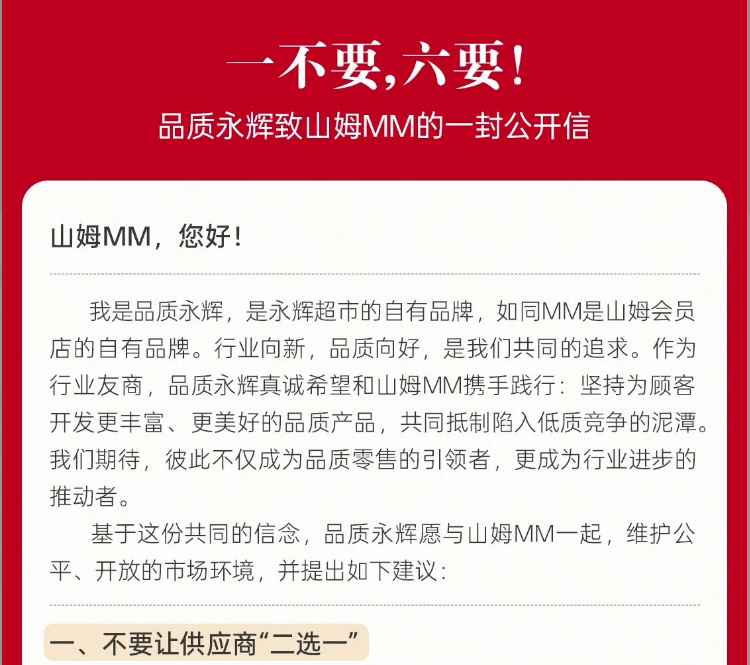 2026年3月16日,永辉超市自有品牌“品质永辉”通过官方公众号发布《致山姆MM的一封公开信》,以行业友商的身份,向山姆发出公平竞争、品质共建的联合倡议,其中重点呼吁山姆“不要让供应商‘二选一’”,坚决反对不正当竞争,同时提出“六要”倡议,涵盖品质提升、配方透明、价格合理等多个维度,成为近期零售行业最受关注的隔空喊话事件。