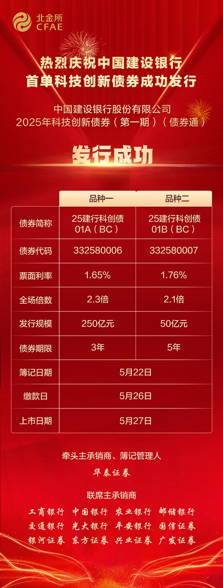 为全面落实人民银行支持发行科技创新债券工作部署,响应交易商协会《关于推出科技债券构建债市“科创板”的通知》要求,北京金融资产交易所(以下简称“北金所”)支持中国建设银行股份有限公司(以下简称“建设银行”)通过簿记建档系统成功发行2025年科技创新债券(第一期)(债券通)。本期债券5月22日发行,5月27日正式上市,发行规模300亿元,其中3年期品种发行规模250亿元,票面利率1.65%,全场认购2.3倍;5年期品种发行规模50亿元,票面利率1.76%,全场认购2.1倍。