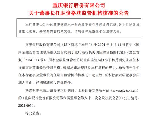 公告显示,重庆银行2024年3月14日收到《国家金融监督管理总局重庆监管局关于重庆银行杨秀明任职资格的批复》。国家金融监督管理总局重庆监管局核准了杨秀明担任该行董事及董事长的任职资格。