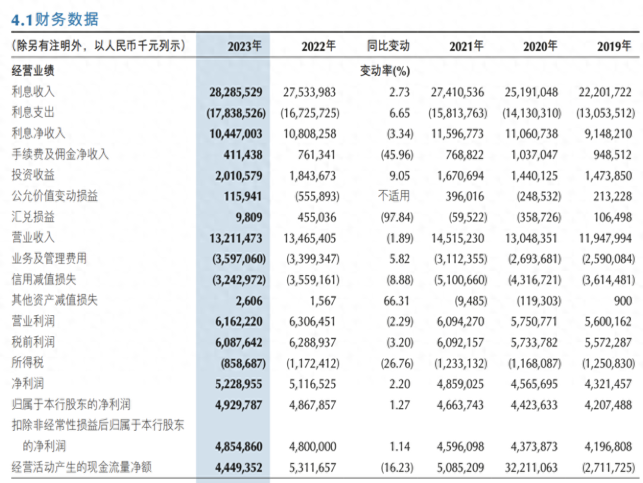 2023年,实现利息净收入为104.47亿元,较上年减少3.61亿元,降幅3.34%;手续费及佣金净收入为4.11亿元,较上年减少3.50亿元,降幅45.96%;公允价值变动损益及投资收益21.27亿元,较上年增加8.39亿元,增幅 65.13%;业务及管理费为35.97亿元,较上年增加1.98亿元,增幅5.82%;信用减值损失为32.43亿元,较上年下降3.16亿元,降幅8.88%。