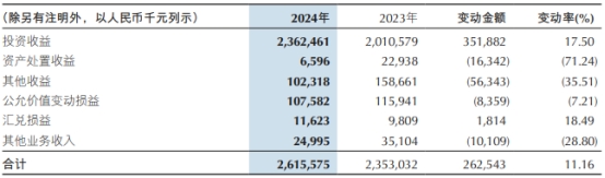 2024年,重庆银行实现其他非利息收入26.16亿元,较上年增加2.63亿元,增幅11.16%。其中,投资收益23.62亿元,较上年末增加3.52亿元,主要是由于2024年处置债券产生的投资收益增加;公允价值变动损益1.08亿元,较上年末减少0.08亿元。