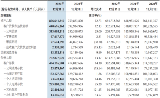 截至2024年12月31日,集团资产总额8,566.42亿元,较上年末增加967.58亿元,增幅12.73%;贷款总额4,406.16亿元,较上年末增加476.81亿元,增幅12.13%;存款总额4,741.17亿元,较上年末增加593.04亿元,增幅14.30%。