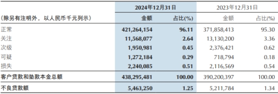 截至2024年12月31日,重庆银行不良贷款余额为54.63亿元,较上年末上升2.51亿元;不良贷款率为1.25%,较上年末下降0.09个百分点;拨备覆盖率245.08%,较上年末上升10.90个百分点。