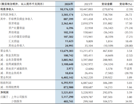 2024年,重庆银行利息净收入为101.76亿元,较上年减少2.71亿元,降幅2.59%;手续费及佣金净收入为8.88亿元,较上年增加4.76亿元,增幅115.73%;公允价值变动损益及投资收益24.70亿元,较上年增加3.44亿元,增幅16.15%;业务及管理费为38.86亿元,较上年增加2.89亿元,增幅8.03%;信用减值损失为31.89亿元,较上年下降0.54亿元,降幅1.68%。