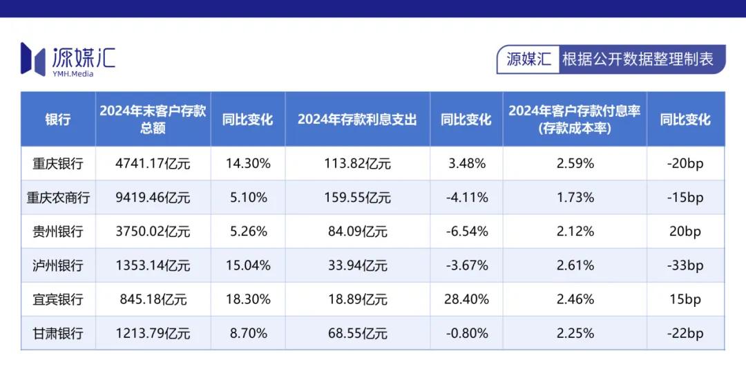 源媒汇对比了几家已经发布2024年最新数据的上市银行客户存款情况,发现除了重庆银行和宜宾银行,其他银行在2024年的存款利息支出都是下降的。当下,重庆银行和宜宾银行的存款付息成本都比较高,两家银行的客户存款规模还都在狂飙,有种“纯走量”的感觉。