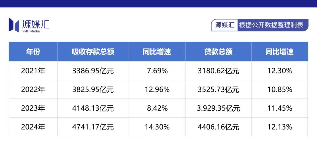 2021年至2024年,重庆银行吸收存款总额分别为3386.95亿元、3825.95亿元、4148.13亿元、4741.17亿元,同比增速分别为7.69%、12.96%、8.42%、14.30%。同期重庆银行的贷款总额分别为3180.62亿元、3525.73亿元、3.929.35亿元、4406.16亿元,同比增速分别为12.30%、10.85%、11.45%、12.13%,有两年贷款增速大幅滞后于存款增速。