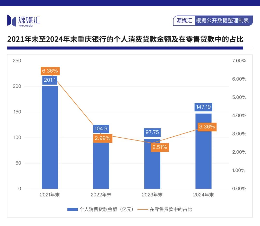追溯过往,2021年末至2024年末,重庆银行的个人消费贷款金额分别为201.10亿元、104.90亿元、97.75亿元、147.19亿元,在零售贷款中的占比分别为6.36%、2.99%、2.51%、3.36%,仍未恢复元气。当下消费不振,要靠个人消费贷突围殊为不易。