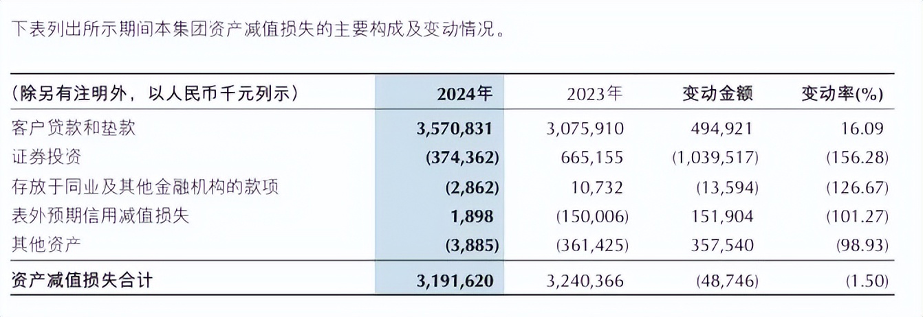 2024年,重庆银行计提减值损失31.92亿元,其中由客户贷款和垫款造成的减值损失达到35.71亿元(部分业务减值损失为负值),同比增长16.09%,是多项资产负债中唯一仍在增长的负债。