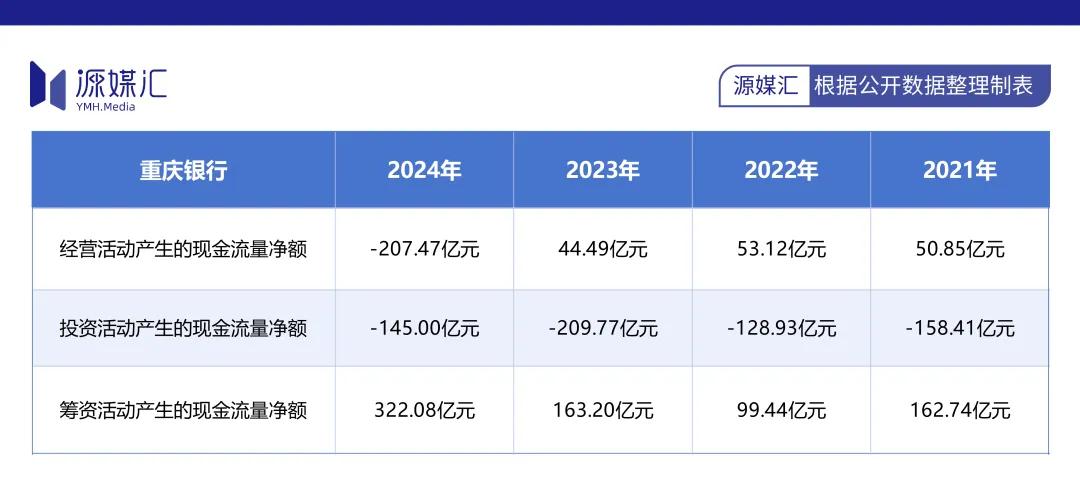 而重庆银行的经营活动现金流量净额,已经应证了这一点。2024年,重庆银行经营活动产生的现金流量净额为-207.47亿元,上年度为净流入44.49亿元。投资活动产生的现金流量净额为-145.00亿元,净流出额同比减少64.77亿元。