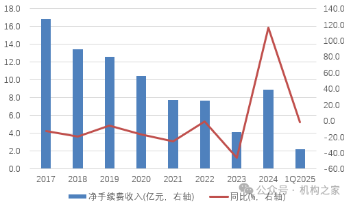 与此同时,在非息收入方面的反复,也成为该行不得不面对的挑战。从中间业务发展来看,重庆银行净手续费收入自2016年开始便陷入了持续的负增长区间:彼时该行实现净手续费收入19.3亿,到了2023年则下降至4.1亿,累计降幅在80%左右,在收入中的占比从20.1%下降至仅为3.1%。2024年,重庆银行净手续费表现迎来久违的反转,同比大增115.7%至8.7亿。不过好景不长,今年一季度来看同比下降1.8%至2.2亿,“拐点论”似乎被打破。其他非息收入方面,债券投资业务也在今年受挫。在过去多年债券牛市背景下推动下,2024年重庆银行实现其他非息收入26.2亿,占比高达19.1%,较上年进一步提升1.3pct。不过从今年一季度来看,占比已经下降至6.1%。根据合并利润表数据显示,今年一季度重庆银行投资端公允价值波动为-3.6亿,大幅侵蚀了投资端业绩表现。