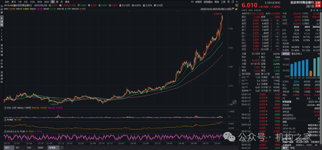 值得注意的,自张培宗担任重庆农商行董秘期间(2020.8-2025.1),该行股价从底部大幅反弹,表现亮眼,期间股价累计上涨幅度超100%,年化涨幅超20%。在此背景下,张培宗获得中国上市公司协会发布的“2024上市公司董事会秘书履职评价”4A级(仅8家银行董秘获悉殊荣),揭示其在公司治理、信息披露等方面的出色表现。不过遗憾的是,目前重庆银行董秘一职已有人选,同样由空降派担任:去年6月,拥有银行和券商背景的侯曦蒙调任重庆银行担任副行长及董事会秘书。