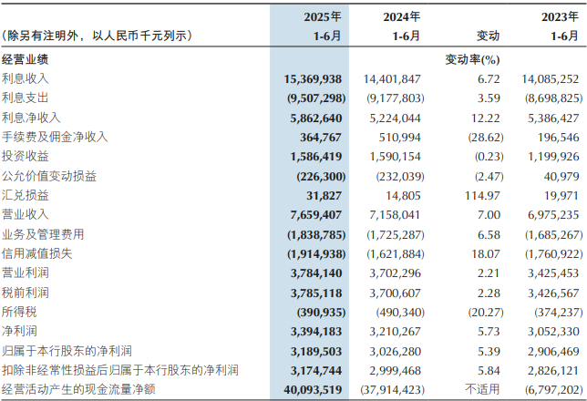 2025年上半年,重庆银行实现营业收入76.59亿元,较上年同期增长7.00%;实现净利润33.94亿元,较上年同期增长5.73%,实现归属于该行股东净利润31.90亿元,较上年同期增长5.39%;实现扣除非经常性损益后归属于该行股东的净利润31.75亿元,较上年同期增长5.84%;经营活动产生的现金流量净额400.94亿元,上年同期为-379.14亿元。