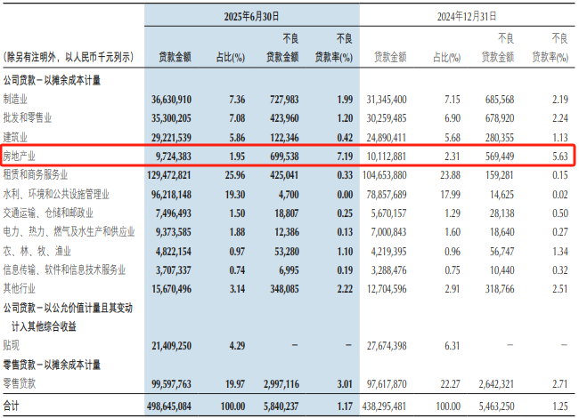 截至2025年6月30日,重庆银行不良贷款余额为58.40亿元,较上年末上升3.77亿元;不良贷款率为1.17%,较上年末下降0.08个百分点。其中,房地产不良贷款率为7.19%,创下2013年上市以来新高。