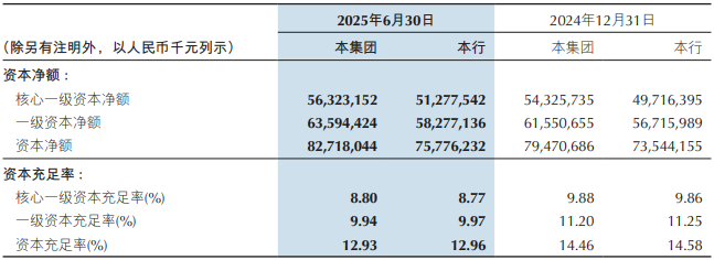 截至2025年6月30日,重庆银行核心一级资本充足率为8.80%,较上年末下降1.08个百分点;一级资本充足率为9.94%,较上年末下降1.26个百分点;资本充足率为12.93%,较上年末下降1.53个百分点。