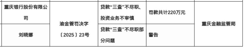 针对上述行为,国家金融监督管理总局重庆监管分局对其罚款共计 220 万元。刘晓娜作为相关责任人,被给予警告处罚。