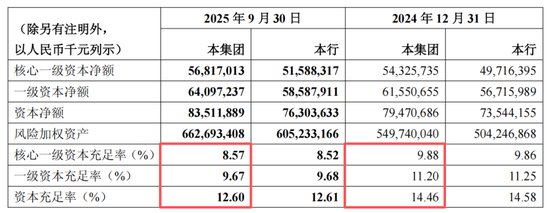 不过,该行资本充足率指标呈现持续下滑趋势,资本补充压力需警惕。数据显示,截至2025年9月末,重庆银行的核心一级资本充足率、一级资本充足率和资本充足率分别为8.57%、9.67%和12.60%,不仅较2025年中报的8.8%、9.94%、12.93%进一步下降,与2024年末相比降幅更为显著,分别减少1.31、1.53、1.86个百分点。