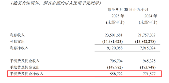 拆分营收结构可见,重庆银行的盈利模式仍高度依赖传统存贷业务,轻资本业务竞争力明显不足。报告期内,重庆银行利息净收入达到91.20亿元,占营业收入的77.68%,相较去年同期增加了12.05亿元,增幅15.22%,是营收增长的核心驱动力;相对应的手续费及佣金净收入则为5.59亿元,占营业收入的4.76%,相较去年同期减少了2.13亿元,降幅27.59%。