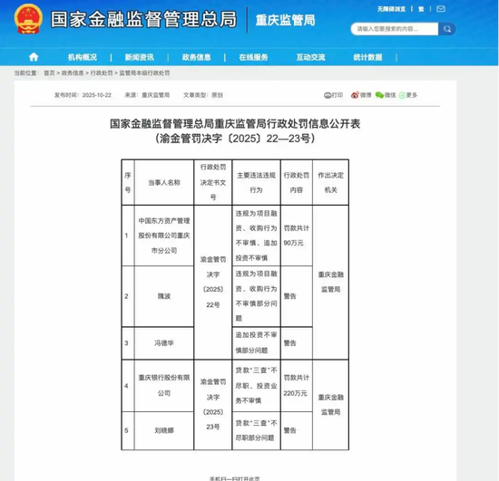 10月22日,国家金融监管总局重庆监管分局公布行政处罚信息显示,因贷款“三查”不尽职、投资业务不审慎问题,重庆银行被处罚款共计220万元,相关责任人刘晓娜因贷款“三查”不尽职部分问题被警告。