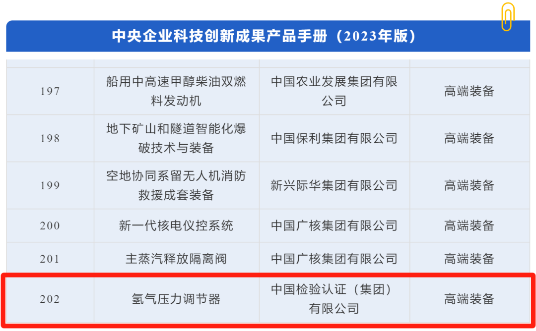 为加快中央企业科技创新成果应用推广,加速科技成果向现实生产力转化,培育发展新质生产力的新动能,国务院国资委组织开展科技创新成果征集遴选工作。4月1日,经企业推荐与专家评审编制形成《中央企业科技创新成果产品手册(2023年版)》,中国中检中国汽研的高端装备成果“氢气压力调节器”成功入选。