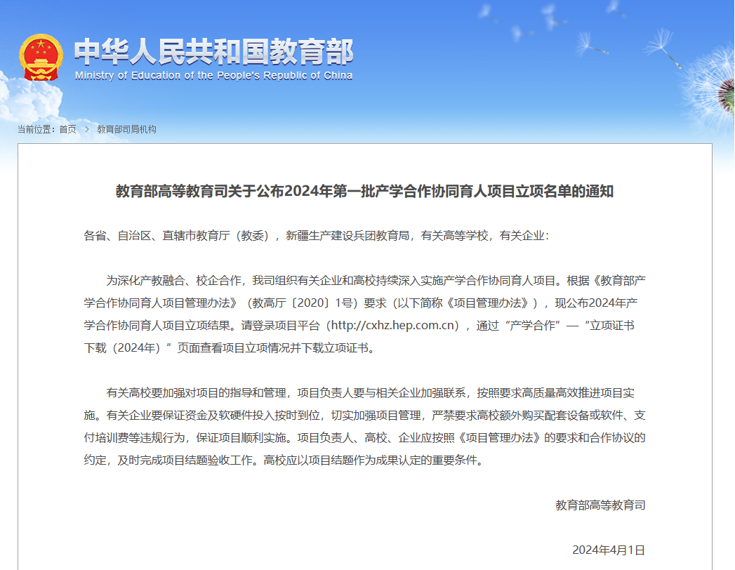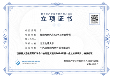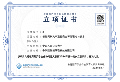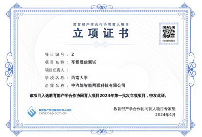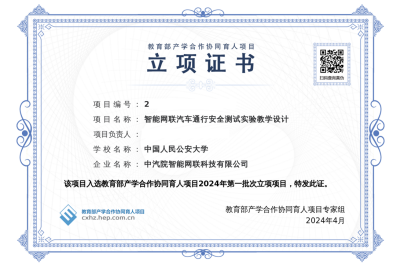 为深化产教融合、校企合作,教育部高等教育司4月公布了2024年第一批产学合作协同育人项目立项名单,并为入选项目颁发立项证书。中汽院智能网联科技有限公司(以下简称“智能网联公司”)设立的5个项目入选。