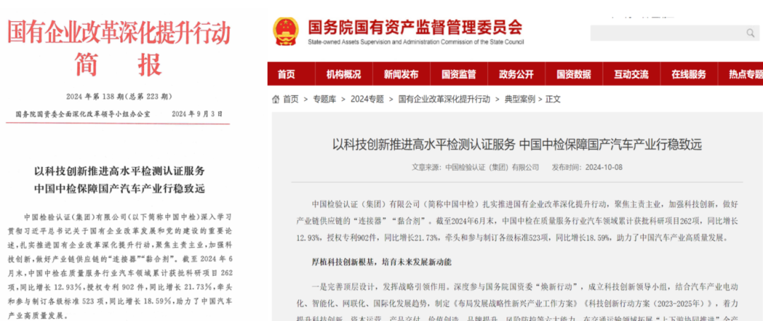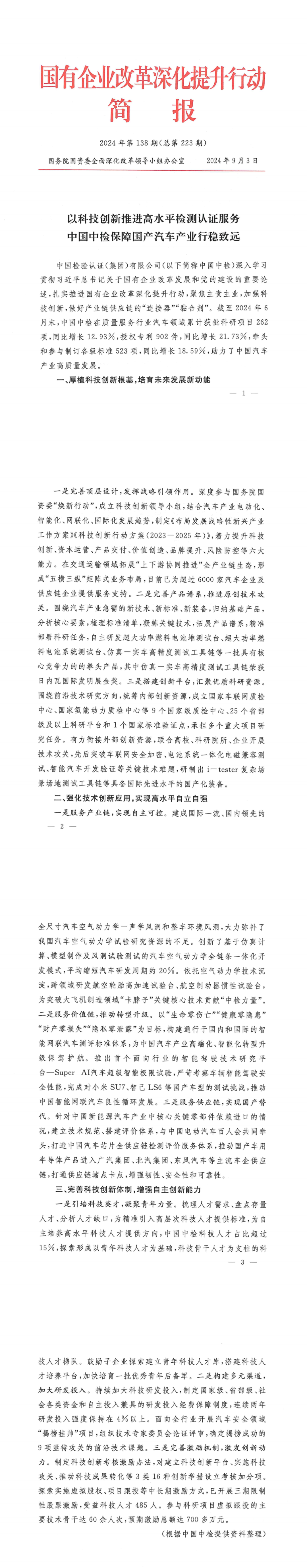 中国汽研参与撰写的《以科技创新推进高水平检测认证服务中国中检保障国产汽车产业行稳致远》稿件在《国有企业改革深化提升行动简报》(2023年第138期)上刊发,并在国务院国资委官网发布。