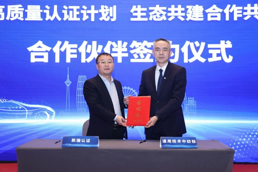 12月5日,在“认证赋能发展·质量护航出海”车辆认证技术交流会上,中纺标总经理李斌与中汽院凯瑞检测认证(重庆)有限公司(中国汽研全资子公司)总经理夏国强共同出席了“高质量认证计划生态共建合作共赢”合作伙伴签约仪式,双方将联合开展国内外主机厂自愿性认证项目工作,通过高质量的认证服务,推动汽车行业向更加安全、环保、智能的方向发展。