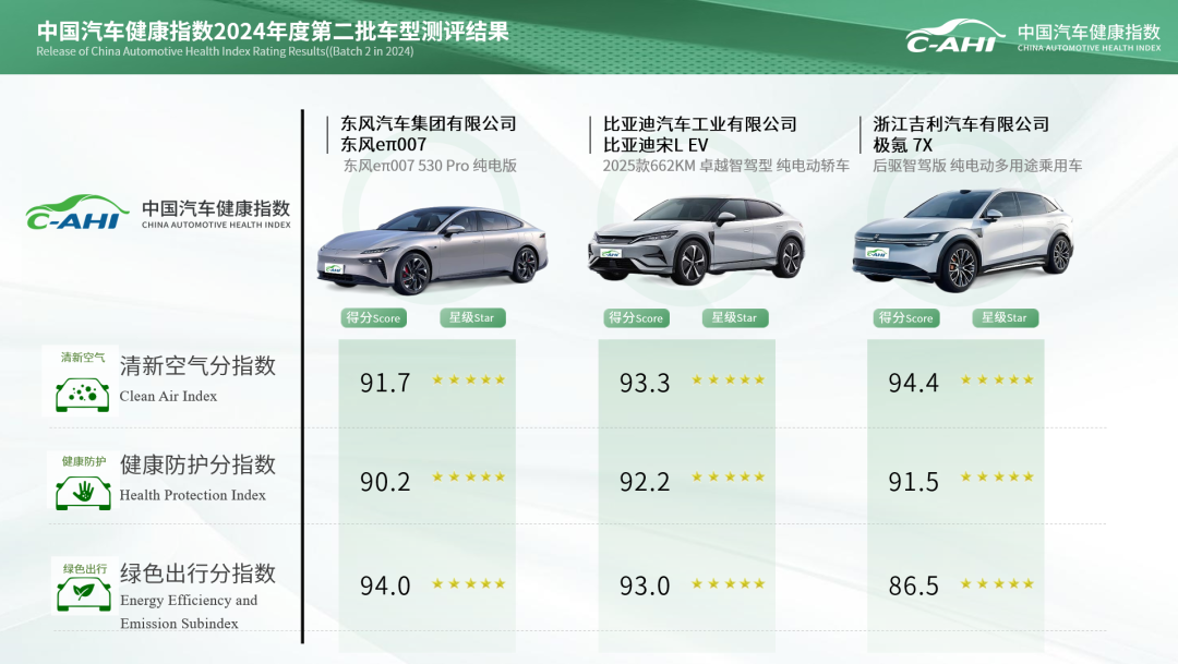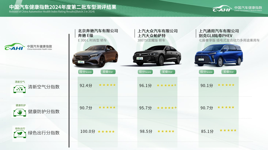 绿色低碳是我国汽车产业转型升级的重要方向,也是各车企落实“双碳”目标、实现高质量发展的重要内涵。C-AHI中国汽车健康指数2023版规程包含清新空气、健康防护、绿色出行三个分指数,发布了奔驰E级、上汽大众帕萨特、别克GL8陆尊PHEV、东风eπ007、比亚迪宋L EV、极氪7X、小米SU7、一汽-大众迈腾、一汽丰田卡罗拉锐放九款车型的测评结果。