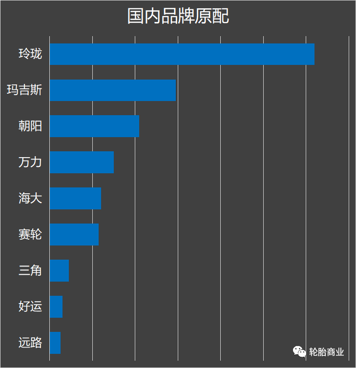 此外,在热火朝天的新能源领域,玲珑轮胎早就具有了先发优势。如图所示,在纯电动汽车原配品牌排行中,玲珑轮胎成功将众多国际名牌甩在身后,稳稳地占据第二位,仅次于米其林。