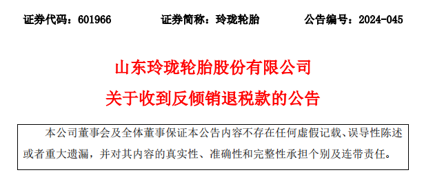 昨日,玲珑轮胎发布公告称,公司于近日陆续收到反倾销退税款5606万美元(约4.08亿人民币),其中本金4912万美元,利息694万美元。