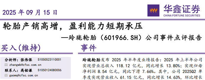 这种失望,不仅体现在玲珑轮胎积弱已久的股价走势上,也体现在在华鑫证券发布的研报中。根据Wind收录的报告,华鑫证券的两位分析师张伟保、高铭谦,在2025年9月为玲珑轮胎出具了题为《轮胎产销高增,盈利能力短期承压》的研报,盈利预测部分的第一句便是:公司盈利能力受到关税等因素影响,短期承压。
