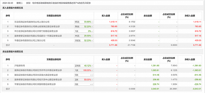 具体来看,东亚前海证券上海分公司、华鑫证券佛山南海海五路证券营业部分别买入1419.11万元、783.85万元;沪股通专用、国海证券崇左凭祥市北环路证券营业部分别卖出1381.60万元、1063.61万元。