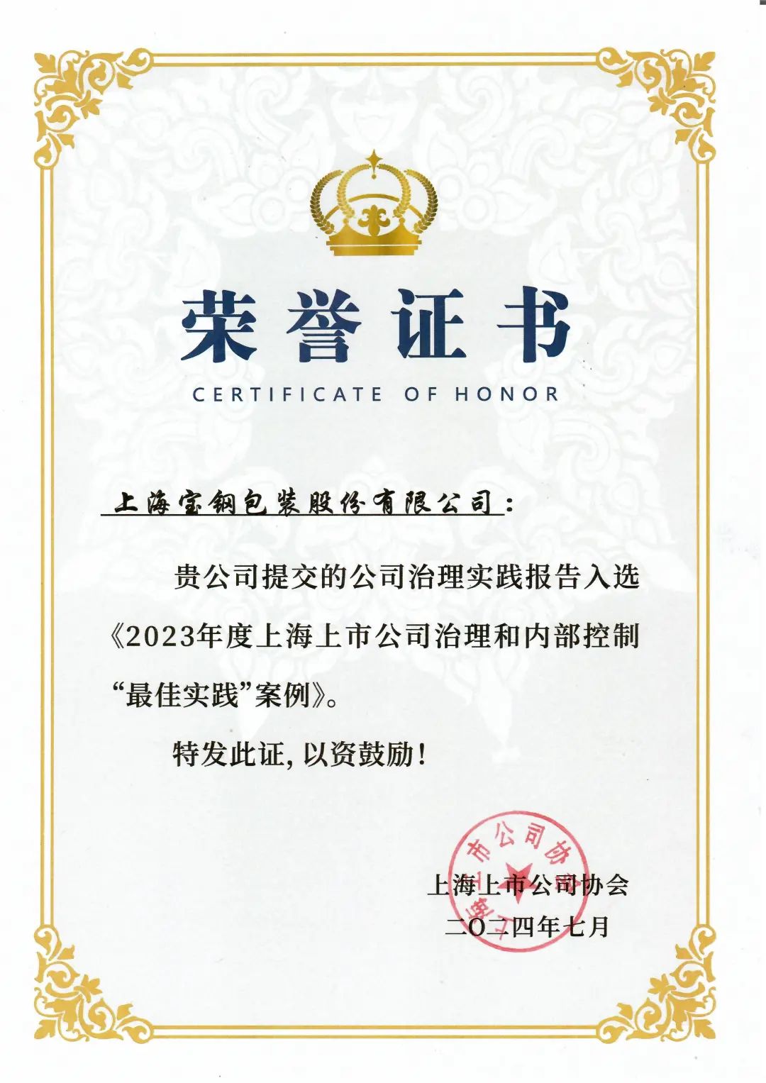 日前,上海上市公司协会发布“上海辖区2023年上市公司治理和内部控制最佳实践”,宝钢包装公司治理实践入选《2023年上海上市公司治理和内部控制“最佳实践”案例》,此为上海上市公司协会给予的最高奖项。展望未来,宝钢包装将积极推进公司治理结构的优化,以促进公司实现更为高效的运营和稳健发展。
