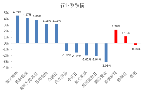 12月1日,冶钢原料板块、特钢Ⅱ板块和普钢板块涨幅分别为2.28%、1.13%和-0.30%,沪深300上涨1.08%,冶钢原料板块和特钢Ⅱ板块分别跑赢大盘1.2pct、0.05pct,普钢板块跑输大盘1.38pct。从全行业看,涨幅前五板块分别是数字媒体(4.59%)、饮料乳品(4.17%)、调味发酵品Ⅱ(3.89%)、休闲食品(3.18%)和白酒Ⅱ(3.16%)。