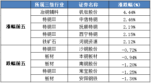 钢铁板块中涨幅前五的公司有钒钛股份(4.44%)、中信特钢(2.46%)、抚顺特钢(2.19%)、西宁特钢(2.19%)和河钢资源(2.12%);跌幅前五的公司分别是沙钢股份(-0.72%)、本钢板材(-0.94%)、南钢股份(-1.20%)、常宝股份(-1.25%)和安阳钢铁(-1.36%)。