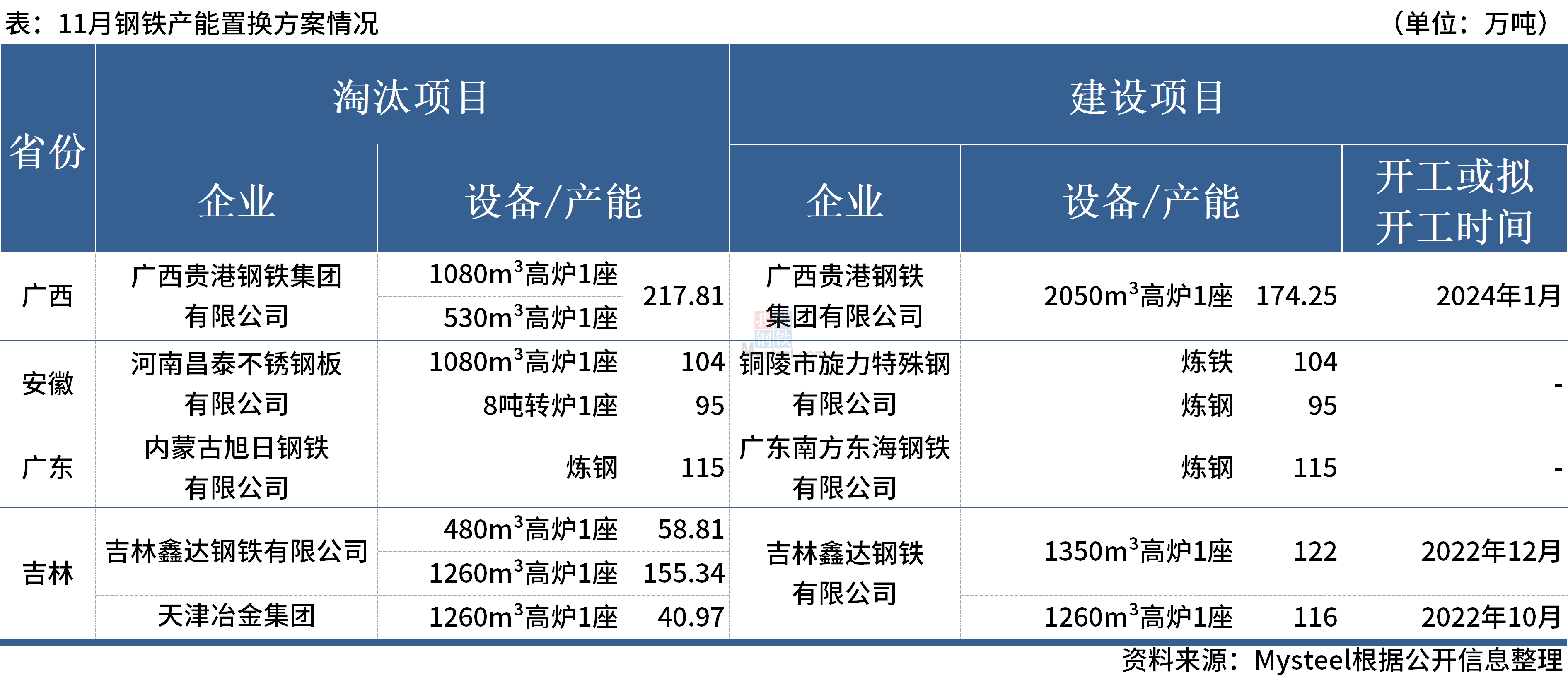 2、Mysteel:11月国内4家钢厂发布钢铁产能置换方案