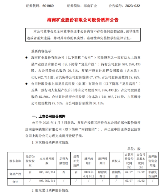海南矿业表示,复星产投本次质押股数为405,962,714股,占其所持股份比例67.97%,占公司总股本比例19.92%,为非融资性质押。
