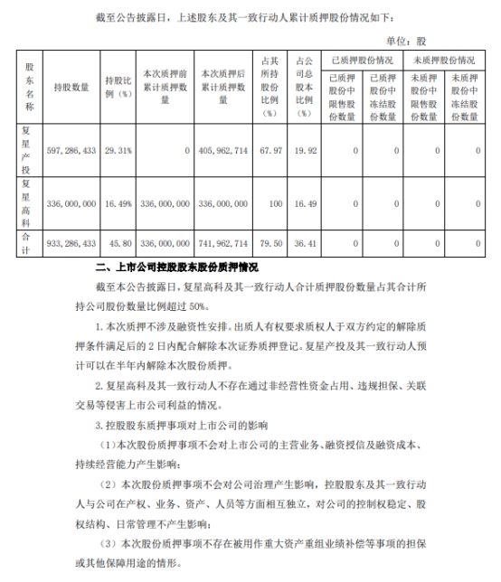 海南矿业指出,截至公告披露日,复星高科及其一致行动人合计质押股份数量占其合计所持公司股份数量比例超过50%。