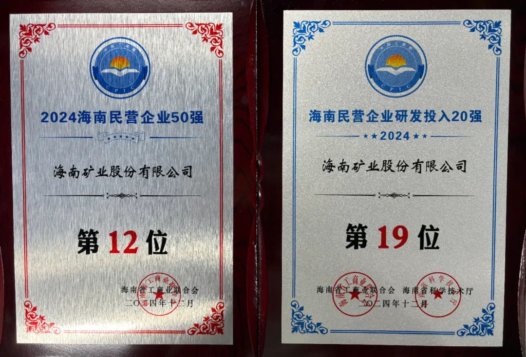 12月2日,2024海南民营企业50强及研发投入20强榜单发布。海南矿业凭借稳健的经营业绩,位列海南民营企业50强第12位,同时在“2024海南民营企业研发投入20强”中位列第19位。
