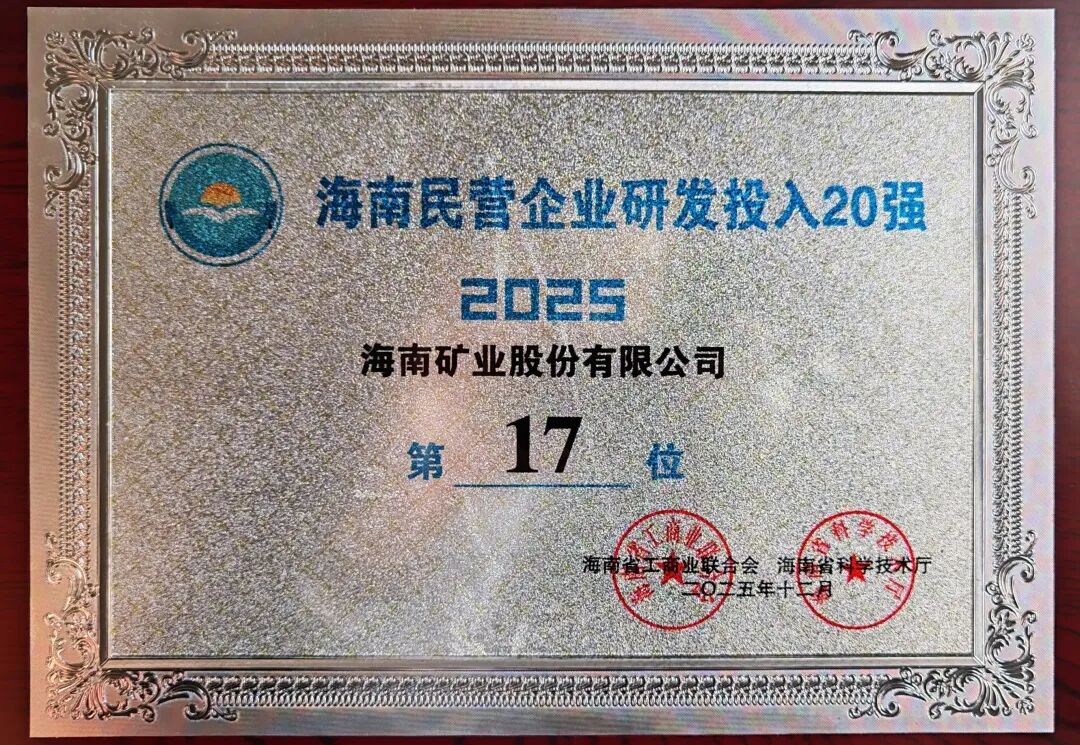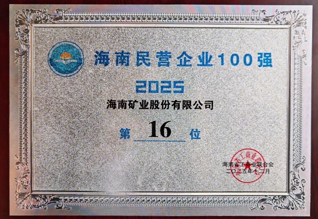2025年12月31日,由海南省委统战部指导,海南省工商联、省科技厅联合主办的“2025海南民营企业100强和研发投入20强”发布会在海口举办。海南矿业凭借稳健的经营表现和持续的创新投入,位列海南民营企业100强第16位,研发投入20强第17位。