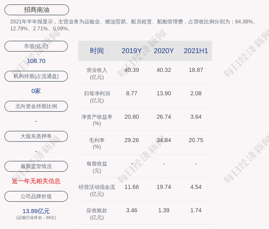 2021年半年报显示,招商南油的主营业务为运输业、燃油贸易、船员租赁、船舶管理费,占营收比例分别为:84.38%、12.79%、2.71%、0.09%。