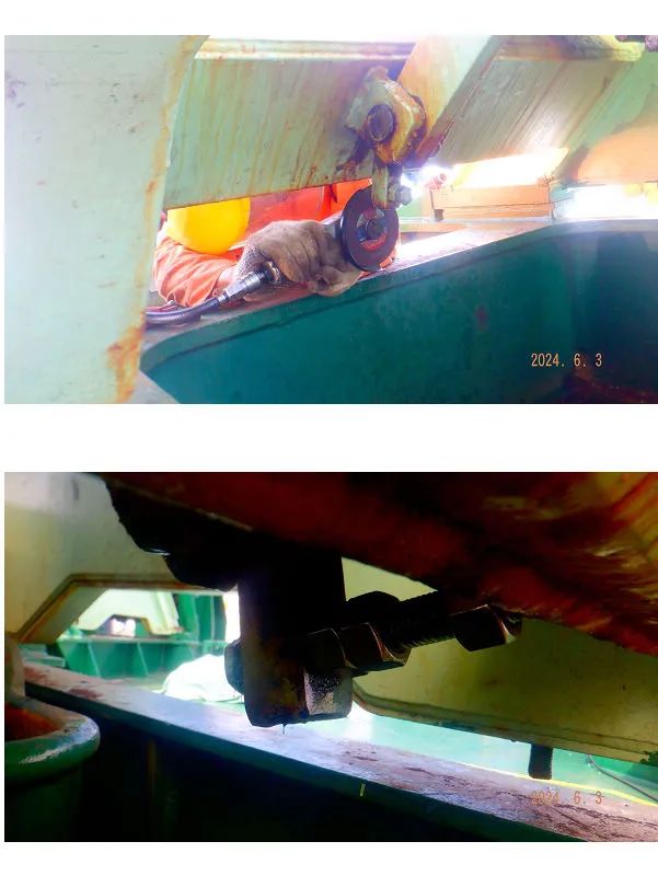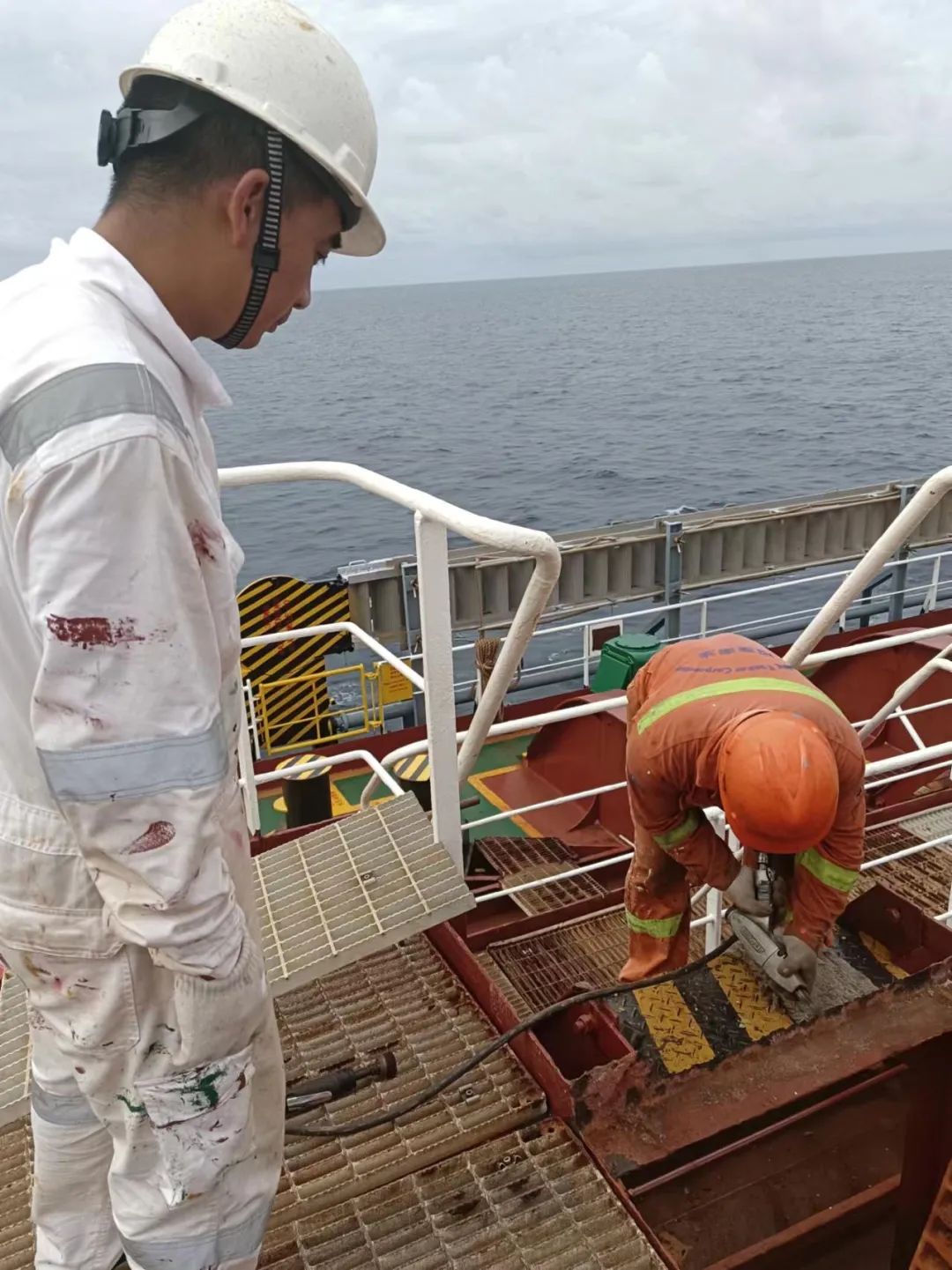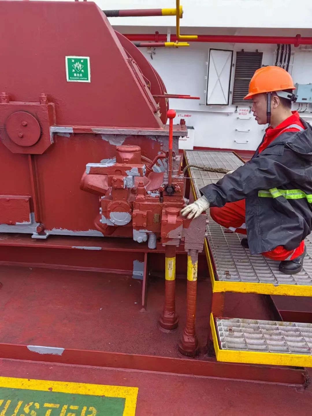 当日上午,船舶大副带领水手长等几名船员仔细分析设备状况,周密布置各种施工安全措施后,对设备进行维护保养,保障设备稳定运行。施工时,船员克服高温、操作不便等困难,经过艰苦努力,完成了检修作业。
