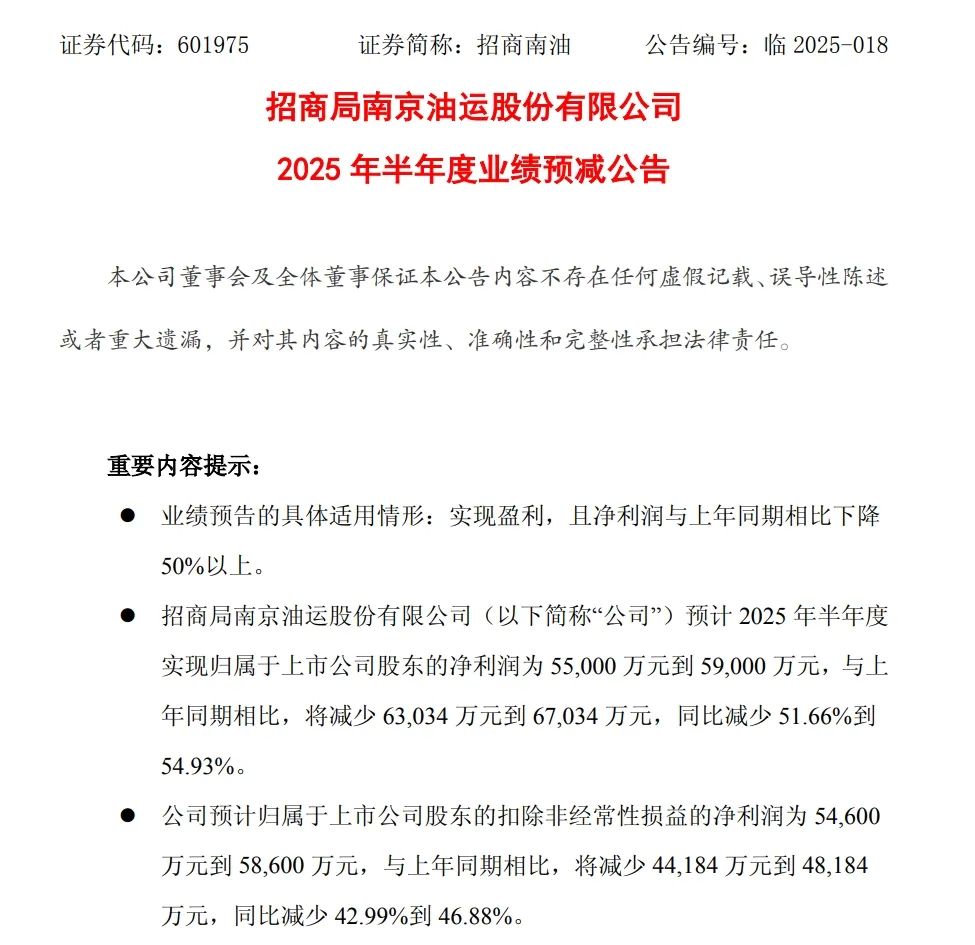 7月8日,招商局南京油运股份有限公司(证券简称:招商南油,证券代码:601975)发布2025年半年度业绩预减公告,预计归属于上市公司股东的净利润为5.5亿元至5.9亿元,同比下降51.66%至54.93%。
