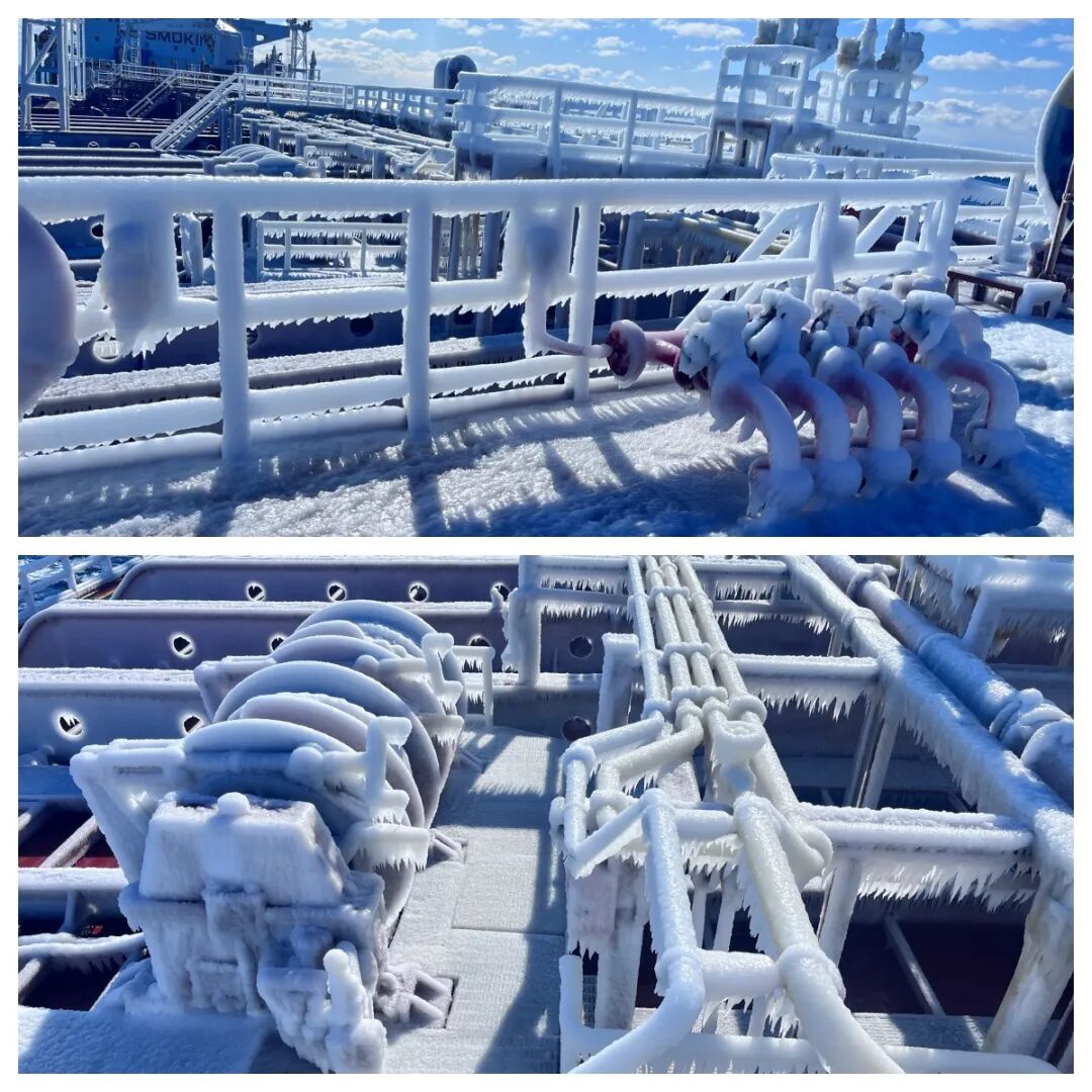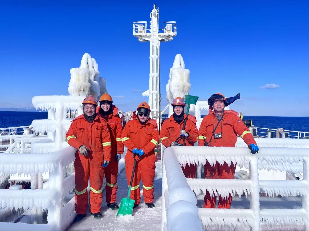近期,招商南油“长航珊瑚”轮执行新年首个外贸航次,前往北海道苫小牧执行装货任务。在辽阔的西北太平洋海域,该轮遭遇极寒天气,甲板及设备被冰层团团包裹,给船舶安全生产运营带来了严峻考验。