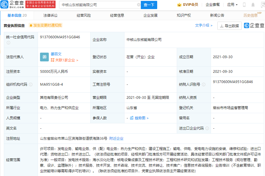企查查APP显示,9月30日,中核山东核能有限公司成立,法定代表人为姜百文,注册资本5亿元人民币,经营范围包含:发电业务、输电业务、供(配)电业务;热力生产和供应;建设工程施工等。