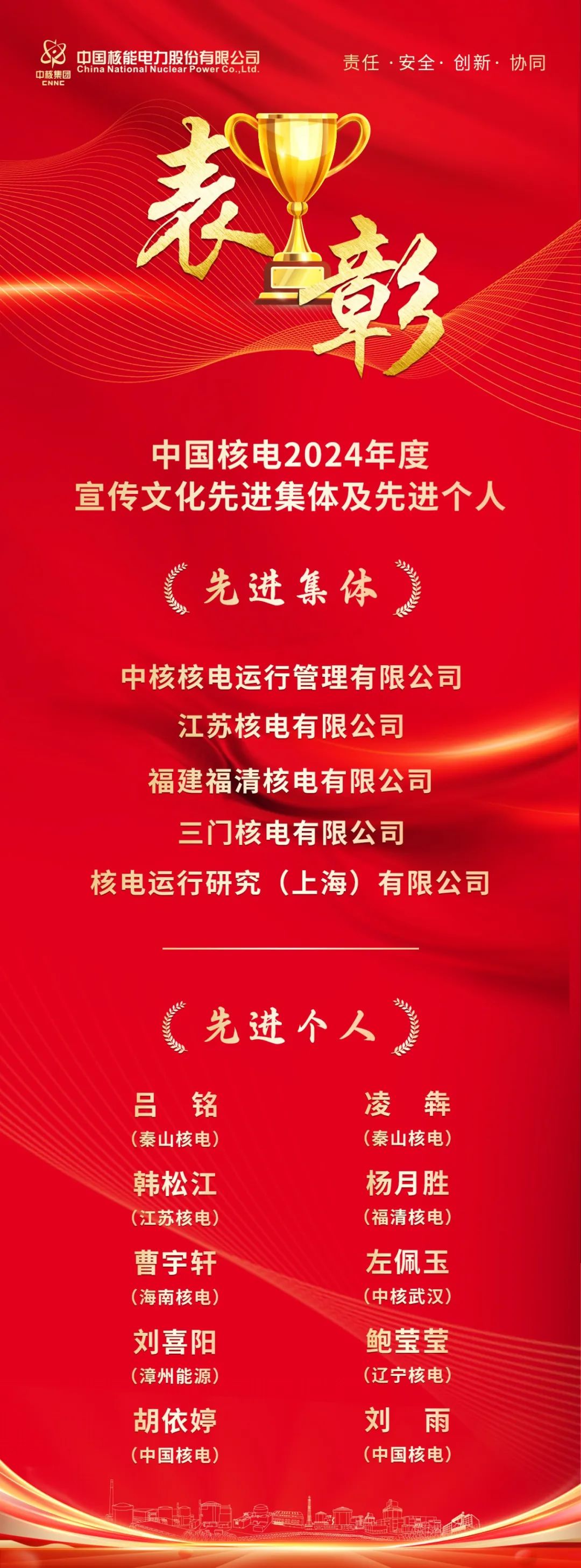 会上还对获得中国核电2024年度基层一线党建荣誉,2024年度党群工作先进集体、优秀党群工作者和中国核电2024年度宣传文化先进集体及先进个人进行了表彰。中核山东、福清核电分别代表中国核电“五星党支部”、中核集团劳动模范作发言。